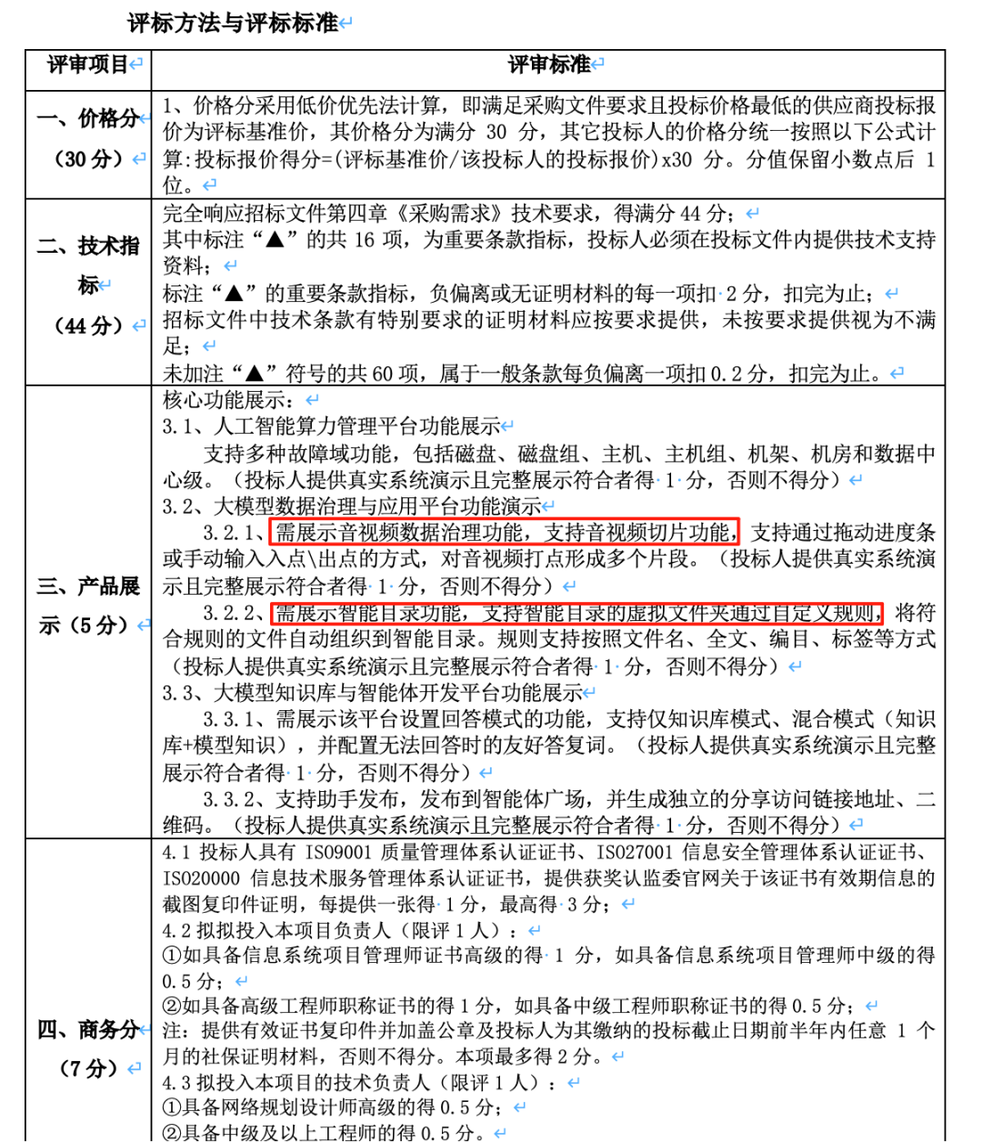 本次招标内容主要围绕人工智能及相关配套设备与平台展开,平台建设齐全,内容不带AI大模型,都不好立项;应用场景局限于问答和办公写作,定制服务工作量在用于知识库的高质量数据集生成;总体预算不多。主流厂商基本具备招标要求的系统功能,数据平台总要有点AI特色。